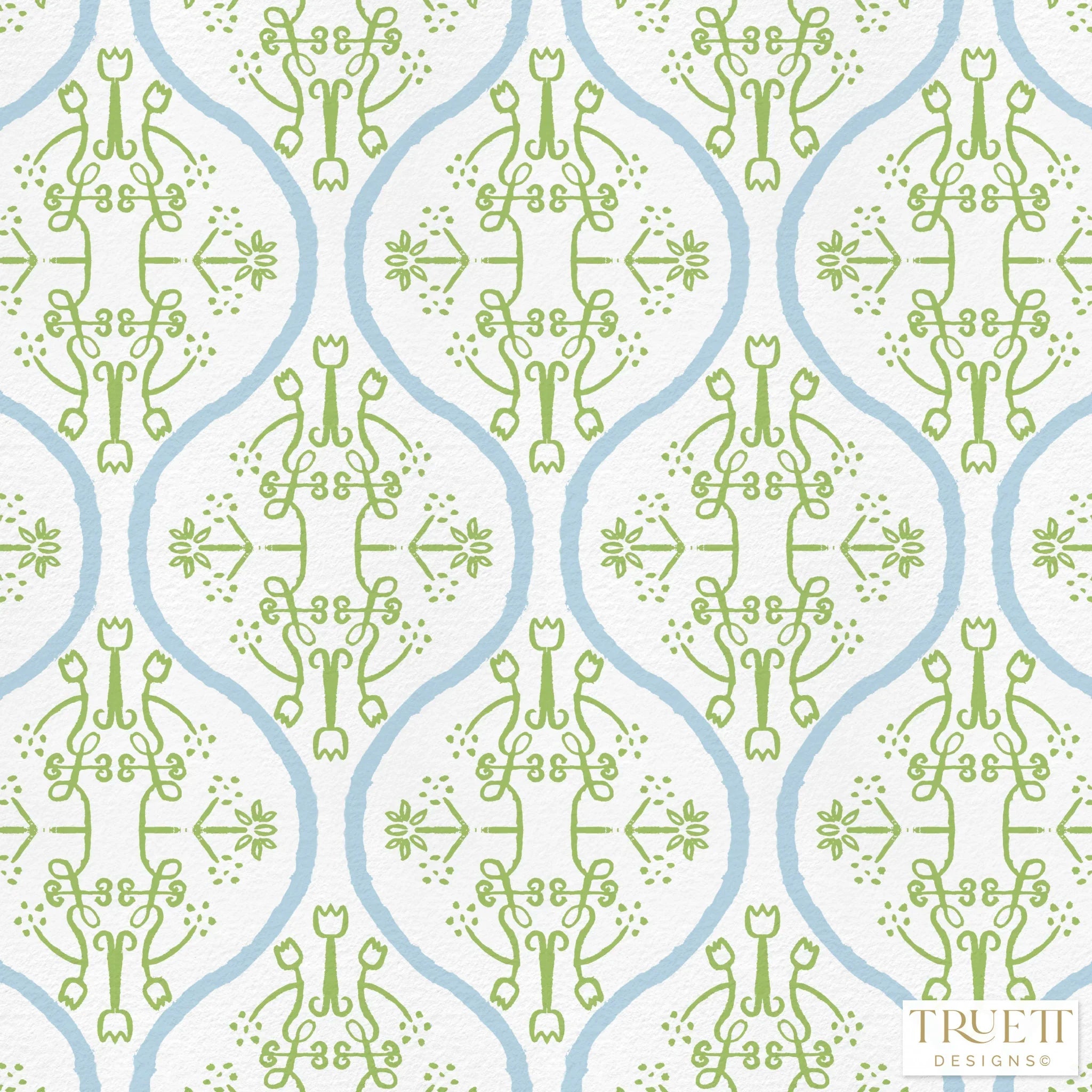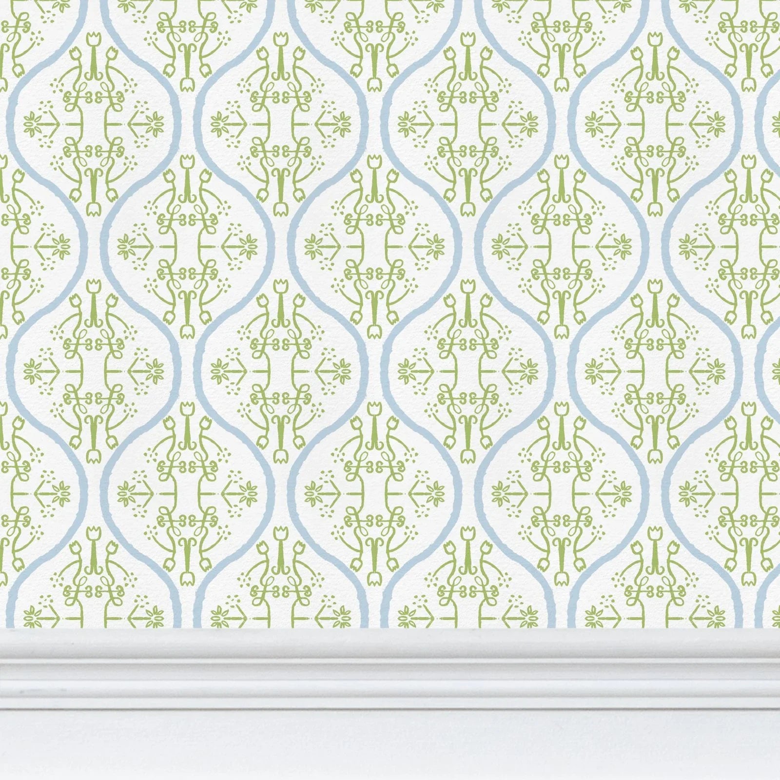 Watercolor Damask White, Sky Blue & Green Luxury Wallpaper